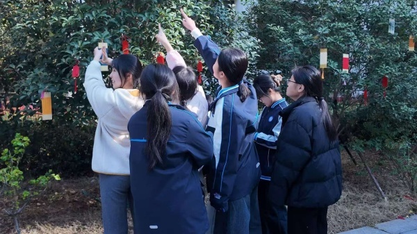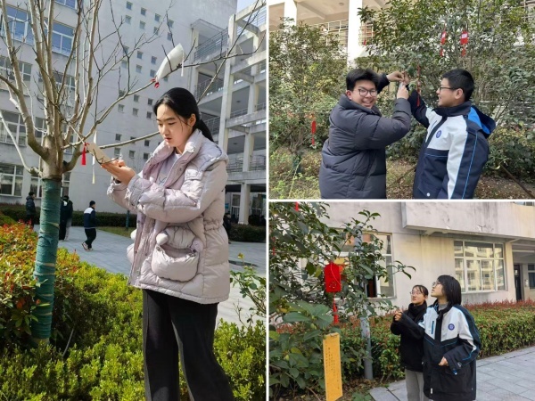 与此同时,A1、A2楼间桂花树区域的春日花语许愿挂牌活动也在温馨开展,充满青春朝气与美好期许。本次许愿挂牌活动以班级为单位有序推进,同学们满怀对校园的热爱、对新学期的成长期许、对未来的美好憧憬,将承载着满满心意的许愿牌悬挂在枝头。有同学写道:“少年迎风踏浪,在雨后拔节生长。”也有同学写道:“喜胜意名夺金科鳌首榜,乐安康声振千山万里江。”微风拂过,一块块色彩清新、字迹工整的许愿牌随风轻扬,与青翠的桂花枝叶相映成趣,为春日校园增添了一抹温馨浪漫的气息。这些小小的许愿牌,不仅是青春心愿的寄托,更凝聚着高一学子对生态文明建设的认同,对自身德智体美劳全面发展的追求。