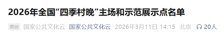 3月11日,国家公共文化云微信公众号公布2026年全国“四季村晚”主场和示范展示点名单。其中,安徽有15地入选。详情如下: