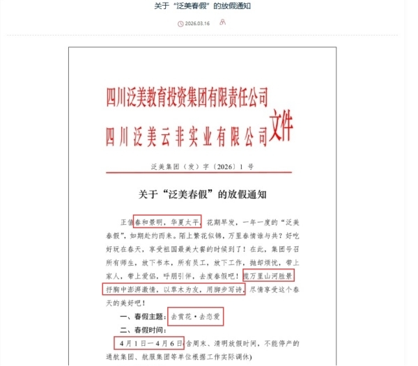 正值春和景明,华夏太平,万物勃发,向新而生。3月16日,记者从宿州航空职业学院获悉,学院2026年春假通知正式发布。4月1日至6日,全校师生将迎来六天专属春假。以“去赏花·去恋爱 ”为主题,走出课堂、走进自然,揽万里山河胜景,抒胸中澎湃激情。以草木为友,用脚步写诗,尽情享受这个春天的美好。在春光里开展多元实践,让青春与成长双向奔赴。