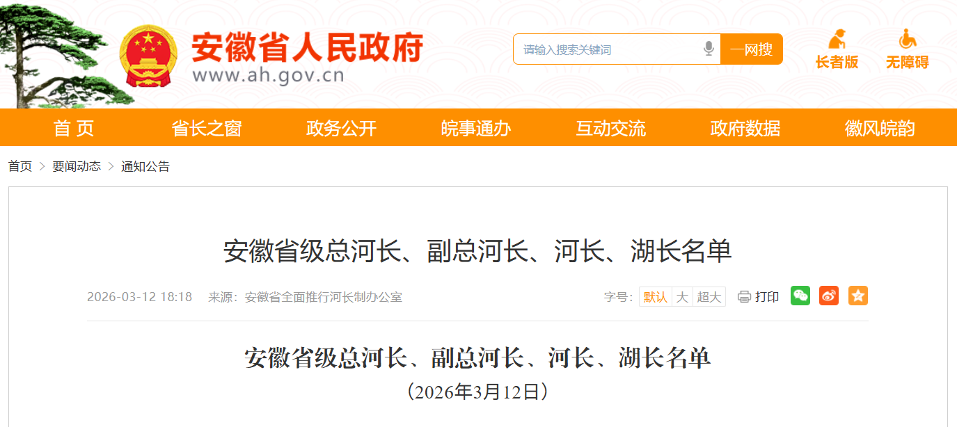 近日,安徽省全面推行河长制办公室发布安徽省级总河长、副总河长、河长、湖长名单,详情如下: