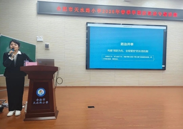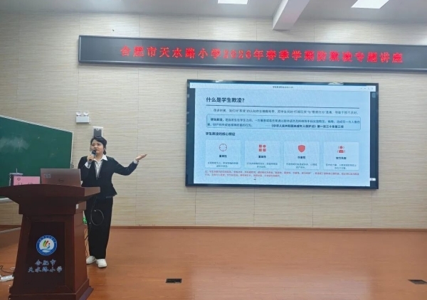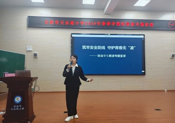 为助力全体教职工精准掌握学生欺凌识别与处置方法,为学生筑牢安全防线,3月13日,合肥市天水路小学特邀请合肥中小学安全工作宣讲团成员、原中国教育电视台主持人、安徽新闻出版学院教师及国家二级心理咨询师吕律老师,组织开展2026年春季学期防欺凌专题讲座。