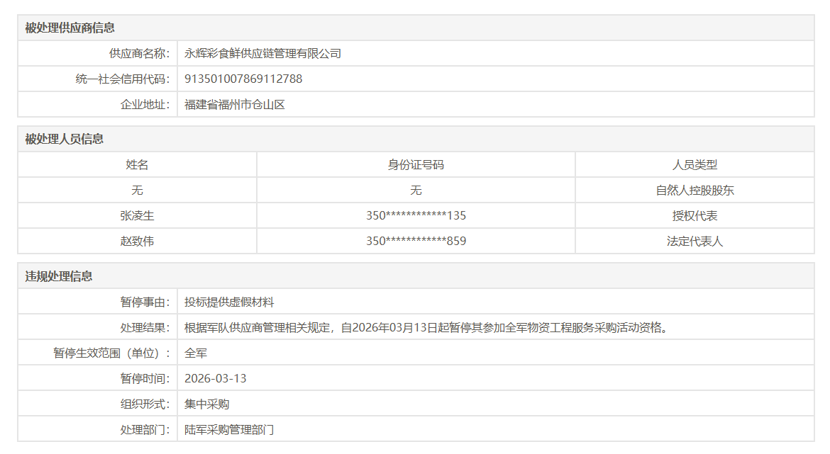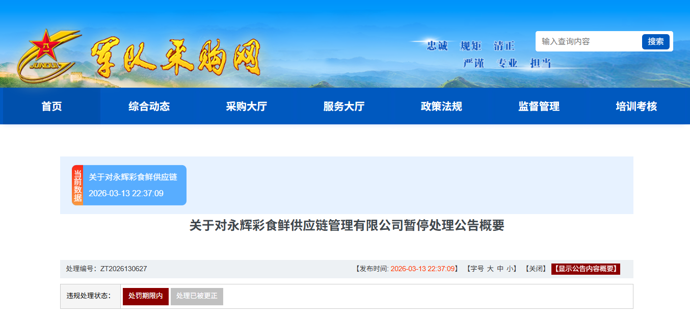 近日,军队采购网公告称,永辉彩食鲜供应链管理有限公司在参加副食品配送服务采购活动中,涉嫌存在投标提供虚假材料等违规行为。根据军队供应商管理相关规定,拟给予你单位暂停参加全军物资工程服务采购活动。详情如下: