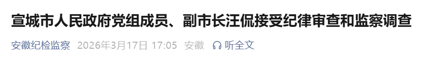 宣城市人民政府党组成员、副市长汪侃涉嫌严重违纪违法,目前正接受安徽省纪委监委纪律审查和监察调查。