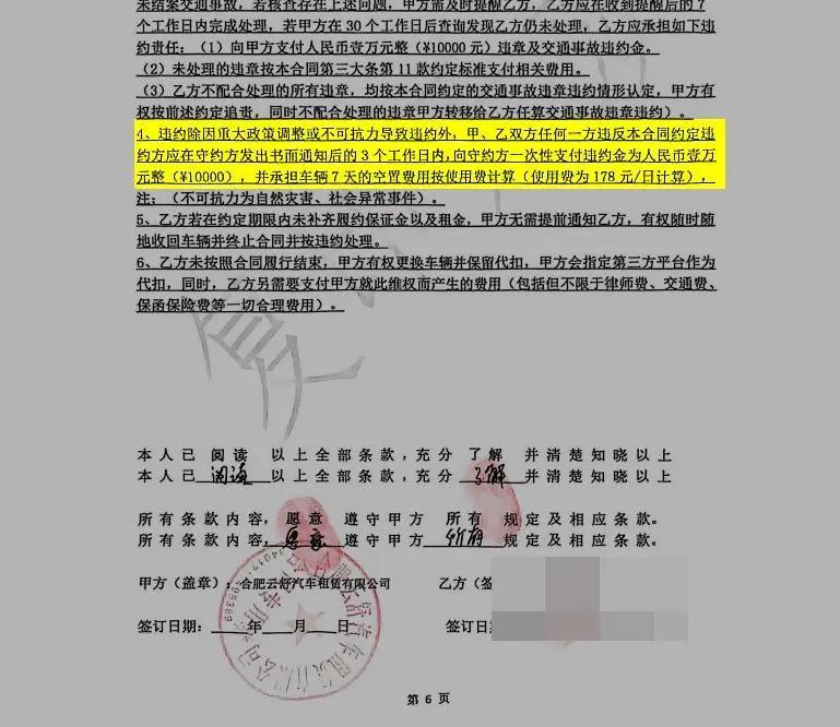 记者从张先生与“合肥宜开云迹汽车科技有限公司”签订的合同中看到,车辆使用性质为营运,张先生需支付履约保证金1000元。而违约条款约定,若应聘者违约,需支付违约金6000元,并承担车辆7天空置期使用费。另一份与“合肥云舒汽车租赁有限公司”签订的租赁合同则约定,每周租金750元,履约保证金3000元,若双方任何一方违约,违约方需支付违约金1万元。