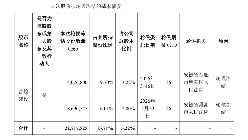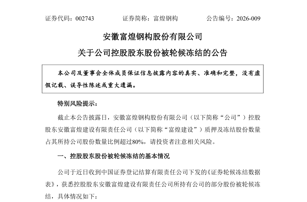 公告指出,截至本公告披露日,富煌建设尚未收到与上述轮候冻结事项相关的法律文书或通知。本次股份轮候冻结事项,暂未对公司的生产经营产生重大影响。公司将持续关注富煌建设股份轮候冻结进展情况,并督促其按照法律法规的相关规定,及时履行信息披露义务。
