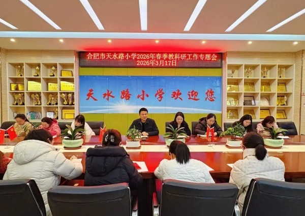 东风拂校催研进,暖韵盈堂促教兴。为明确新学期教研方向,凝聚合力提升教学质量,3月18日,合肥市天水路小学召开2026年春季教研工作会议。本次会议由教研室副主任魏玮主持,校长苗峰、副校长慈正英、教务处主任李凤月、副主任吴先桂、教研室主任刘娜及各学科教研组长、课题负责人、备课组长等老师参会,共绘教研发展新蓝图。