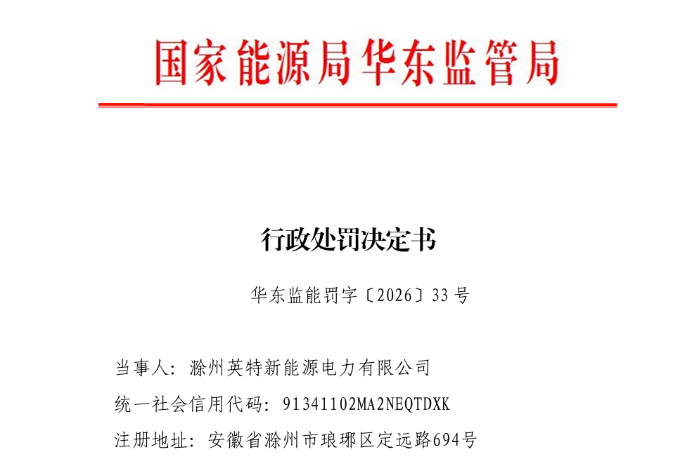 近日,据“国家能源局华东监管局”公开披露信息显示,因采取欺骗等不正当手段取得承装(修、试)电力设施许可,滁州英特新能源电力有限公司被处以罚款2万元。行政处罚决定书文号是华东监能罚字〔2026〕33号。