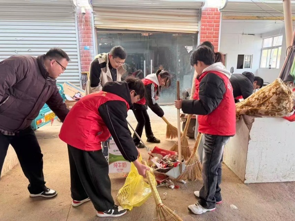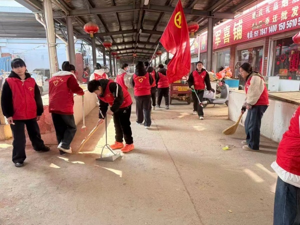 活动中,志愿者们手持清洁工具,分工协作、密切配合,对菜市场路面、绿化带及卫生死角进行全面清扫,捡拾垃圾、清理杂物,规范摆放乱停车辆。党员教师以身作则、率先垂范,学生志愿者热情高涨、不怕脏累,用实际行动净化周边环境,弘扬“奉献、友爱、互助、进步”的志愿精神。