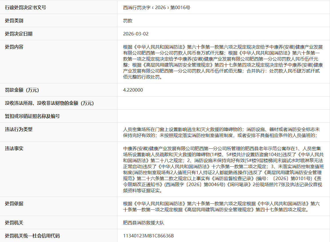 近日,据“信用安徽”公开披露行政处罚信息,因管理的肥西县老年示范公寓存在多项消防安全隐患,中康养(安徽)健康产业发展有限公司肥西第一分公司被处以罚款4.22万元。行政处罚决定书文号是西消行罚决字﹝2026﹞第0016号。