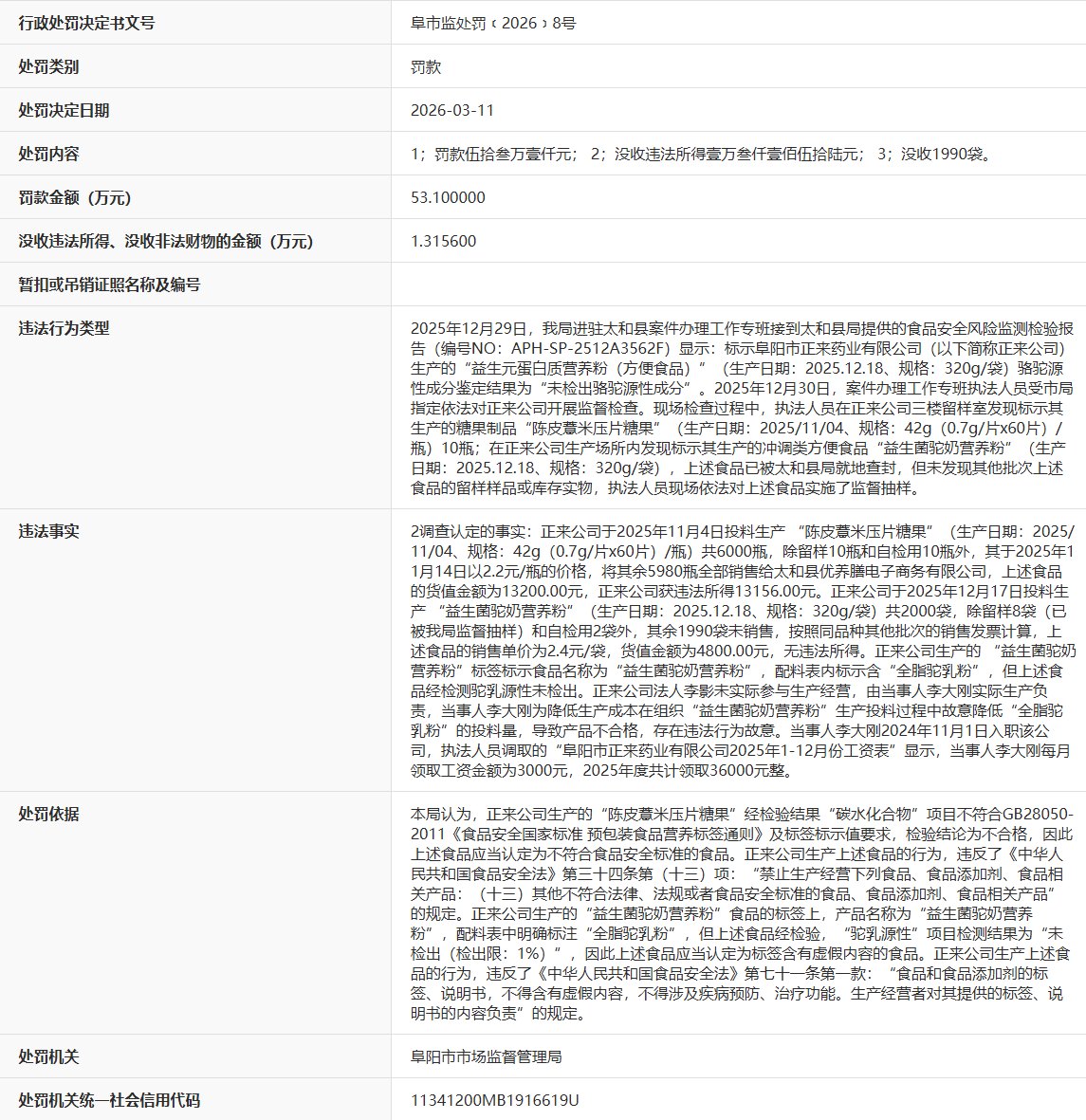 近日,据“信用安徽”公开披露行政处罚信息,因生产标签虚假、生产不符合食品安全标准的食品,阜阳市正来药业有限公司被处以罚款53.1万元,被没收违法所得1.3156万元。行政处罚决定书文号是阜市监处罚﹝2026﹞8号。