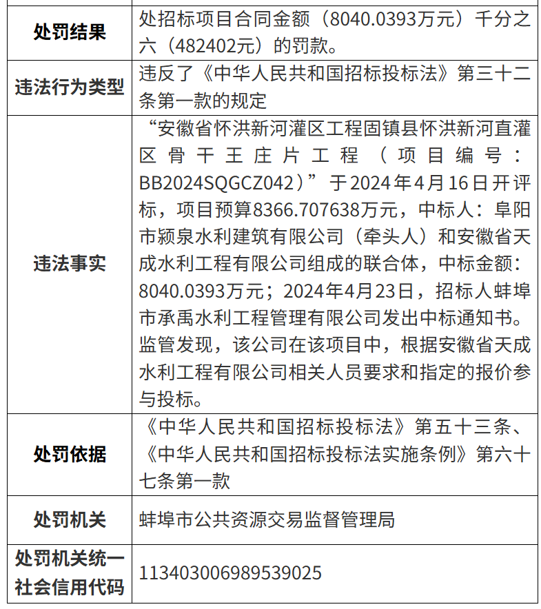 公开处罚信息显示,“安徽省怀洪新河灌区工程固镇县怀洪新河直灌区骨干王庄片工程(项目编号:BB2024SQGCZ042)”于2024年4月16日开评标,项目预算8366.707638万元,中标人:阜阳市颍泉水利建筑有限公司(牵头人)和安徽省天成水利工程有限公司组成的联合体,中标金额:8040.0393万元;2024年4月23日,招标人蚌埠市承禹水利工程管理有限公司发出中标通知书。监管发现,这20家公司在该项目中均根据安徽省天成水利工程有限公司相关人员要求和指定的报价参与投标。