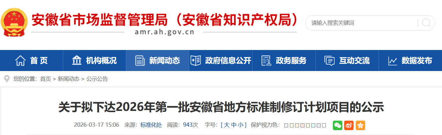 近日,安徽省市场监督管理局发布关于拟下达2026年第一批安徽省地方标准制修订计划项目的公示,详情如下: