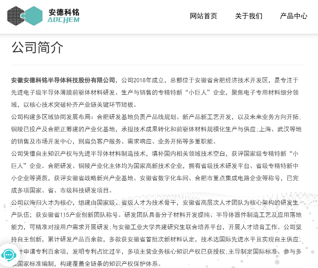 公司官网信息显示,安徽安德科铭半导体科技股份有限公司,公司2018年成立,总部位于安徽省合肥经济技术开发区,是专注于先进电子级半导体薄膜前驱体材料研发、生产与销售的专精特新“小巨人”企业,聚焦电子专用材料细分领域,以核心技术突破补齐产业链关键环节短板。公司凭借自主知识产权与先进半导体材料制造技术,填补国内相关领域技术空白,获评国家级专精特新“小巨人”企业。合肥研发、铜陵产业化主体均为国家高新技术企业,拥有省级技术研发平台、省级专精特新中小企业等资质,获评安徽省战略新兴产业基地、安徽省数字化车间、合肥市重点集成电路企业等称号,已完成多项国家、省、市级科技研发项目。