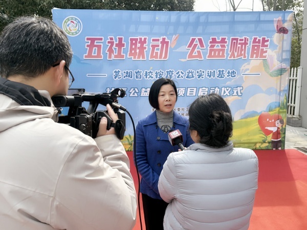 启动仪式结束后,席蔚菁校长接受了芜湖新闻联播的采访,她表示,此次校社合作是深化“五社联动”机制的生动实践,未来将持续凝聚社区、学校、公益组织等多方力量,把实训基地打造成校社合作的典范,让视障学生在实践中成长,让公益服务温暖更多家庭,为和美社区建设注入特殊温度。