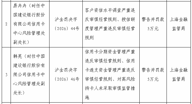 同时,时任建设银行信用卡中心风险管理处副处长易卉卉因对“客户资信水平调查严重违反审慎经营规则、授信额度管理严重违反审慎经营规则”等违规行为负有责任,被警告并罚款5万元。行政处罚决定书文号是沪金罚决字〔2026〕44号。