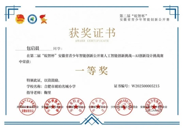 热烈庆祝合肥市琥珀名城小学学子在第二届“皖智杯”安徽省青少年智能创新公开赛中再创佳绩,十位学子凭借过硬的专业素养、出色的创新思维与实践能力脱颖而出,摘得嘉奖!