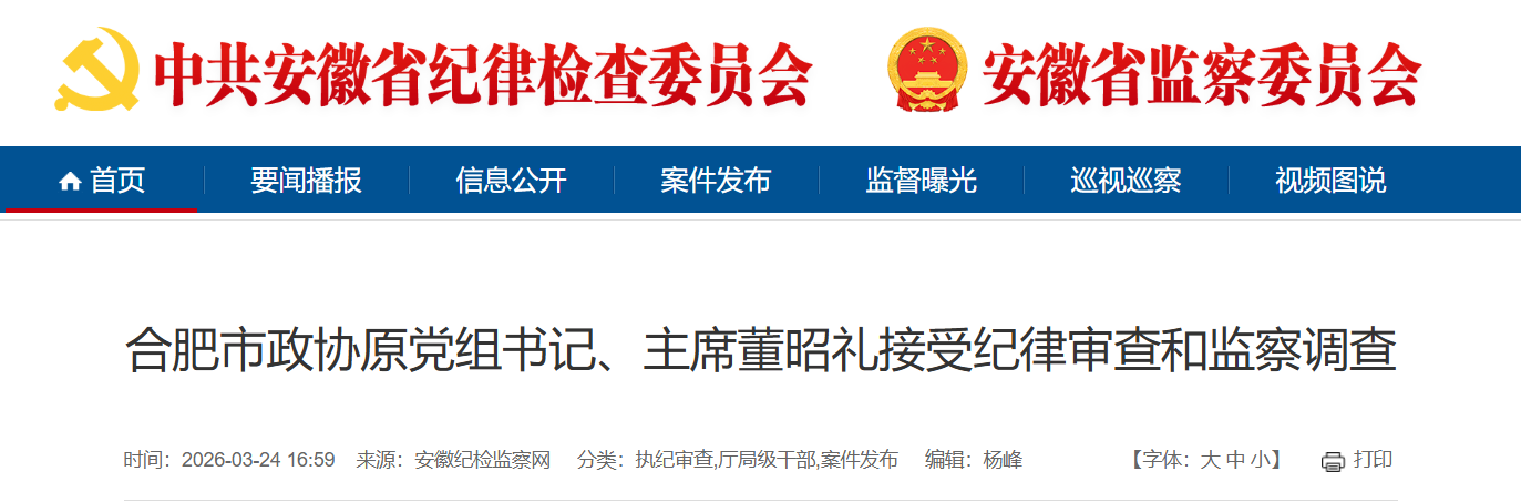 合肥市政协原党组书记、主席董昭礼涉嫌严重违纪违法,目前正接受安徽省纪委监委纪律审查和监察调查。