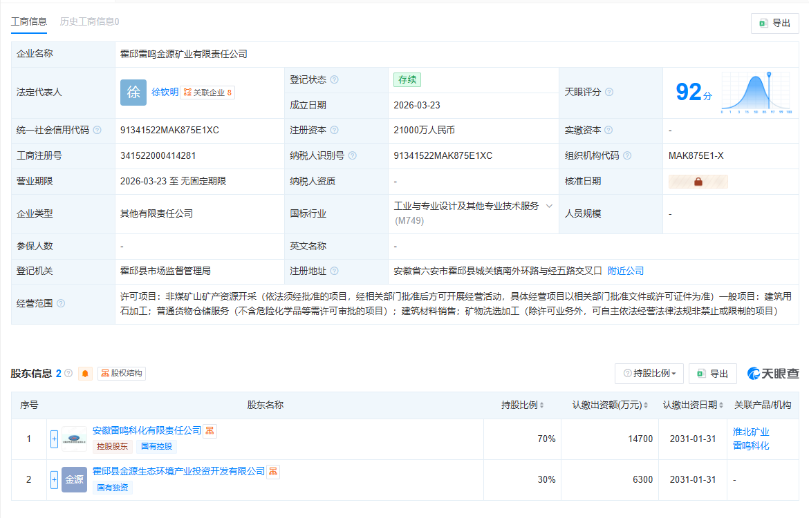 天眼查信息显示,近日,霍邱雷鸣金源矿业有限责任公司成立,注册资本2.1亿元,经营范围包含非煤矿山矿产资源开采、建筑用石加工、普通货物仓储服务、建筑材料销售、矿物洗选加工等。股东信息显示,该公司由淮北矿业全资子公司安徽雷鸣科化有限责任公司等共同持股。