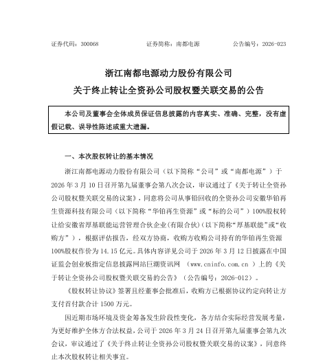 3月24日晚间,南都电源(300068.SZ)发布终止转让全资孙公司股权暨关联交易的公告,公司逾14亿元交易因故夭折。