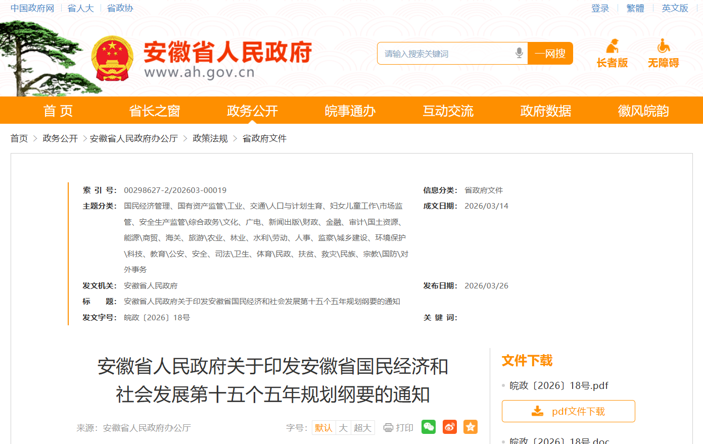 3月26日,安徽省人民政府网发布安徽省“十五五”规划纲要,全文共十八篇七十八章。