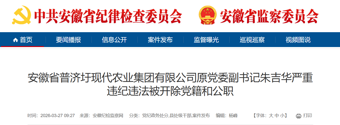 据“安徽纪检监察网”3月27日消息,日前,经中共铜陵市委批准,铜陵市纪委监委对安徽省普济圩现代农业集团有限公司原党委副书记朱吉华严重违纪违法问题进行了立案审查调查。