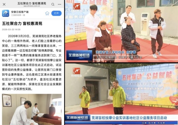 近日,芜湖盲校与清苑社区携手共建的芜湖盲校按摩公益实训基地社区公益服务项目正式启动。《安徽日报》客户端、芜湖新闻综合频道《芜湖新闻联播》予以报道,成为深化“五社联动”、赋能特殊群体、建设和美社区的生动实践。