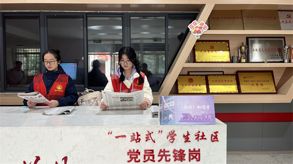 在淮南师范学院外国语学院一站式学生社区,“信致远”党员先锋岗不仅是学生党员开展志愿服务的主阵地,更成为理论学习的“流动课堂”。日常学风督查、报刊发放、会务服务……党员们在值班间隙,随手拿起一份《人民日报》《安徽日报》《安徽青年报》等报纸,读时事、学理论,做新时代思想进步的大学生。