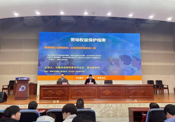 普法宣讲环节中,安徽来思律师事务所主任曹元海以案释法,围绕“就业红线”“薪酬权益”“安全保障”“维权路径”四个维度,详细讲解了试用期规定、劳动合同必备条款、最低工资标准、加班工资计算、工伤保险、职业病防治以及劳动仲裁流程、法律援助渠道等内容,为同学们带来一堂生动实用的“法治就业课”。