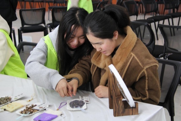 随后,老师为大家科普了非遗香包的疗愈价值与芳香疗法对情绪的调节作用。现场展示了薰衣草、艾草等天然草本香料,盲生们通过敏锐的嗅觉辨识香料,志愿者们则在一旁辅助描述香料的质地与色彩。在双向感知中,大家共同感受着草木香气带来的舒缓力量,深刻体会到了非遗技艺与心理疗愈的深度融合。