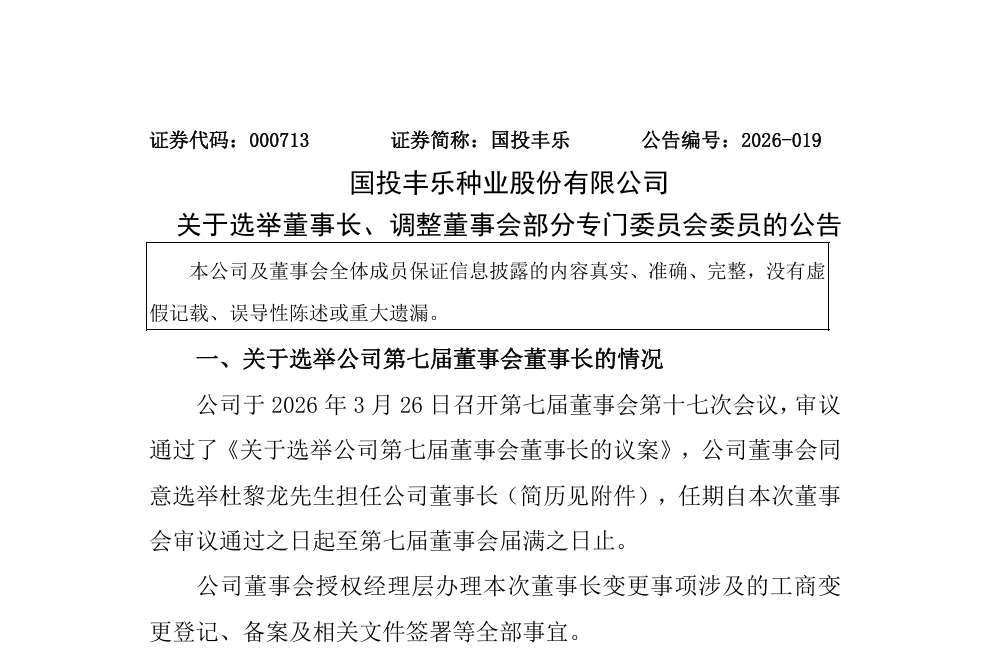 3月27日,国投丰乐种业股份有限公司董事会发布公告,公司董事会同意选举杜黎龙先生担任公司董事长。详情如下: