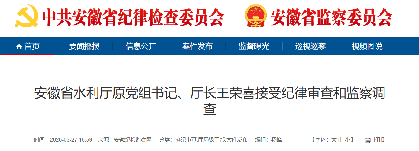 据安徽纪检监察网3月27日消息,安徽省水利厅原党组书记、厅长王荣喜涉嫌严重违纪违法,目前正接受安徽省纪委监委纪律审查和监察调查。