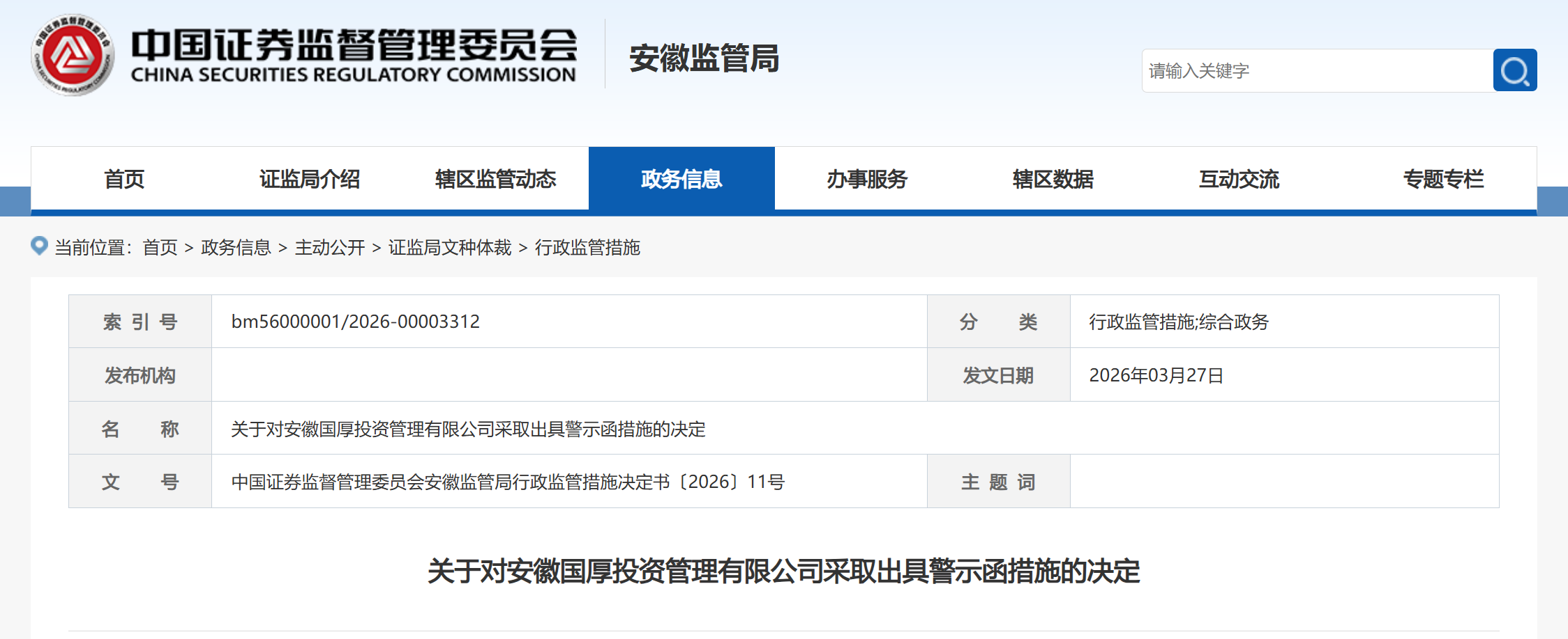 近日,安徽证监局发布行政监管措施决定书,剑指安徽国厚投资管理有限公司。公开处罚信息显示,因未及时更新管理人从业人员有关信息、个别私募基金未办理基金备案手续事项未完成整改,安徽国厚投资管理有限公司被出具警示函。详情如下: