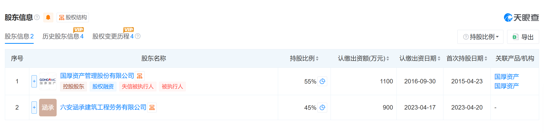 天眼查信息显示,安徽国厚投资管理有限公司(简称国厚投资)成立于2015年04月23日,位于安徽省芜湖市,由国厚资产管理股份有限公司和六安涵承建筑工程劳务有限公司共同持股。风险方面共发现企业有天眼风险信息1895条。