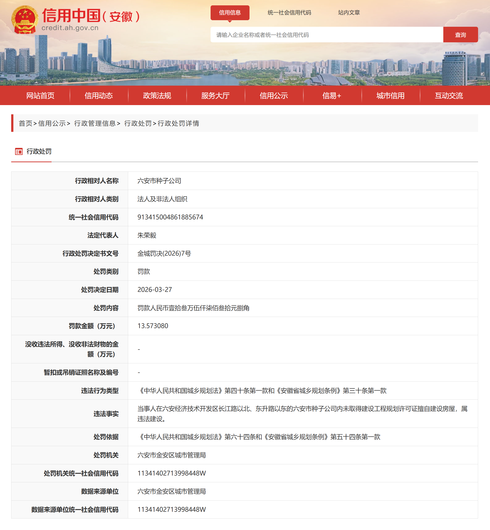 近日,据信用安徽公开披露行政处罚信息,因未取得建设工程规划许可证擅自建设房屋,六安市种子公司被处以罚款13.573080万元。行政处罚决定书文号为金城罚决(2026)7号。