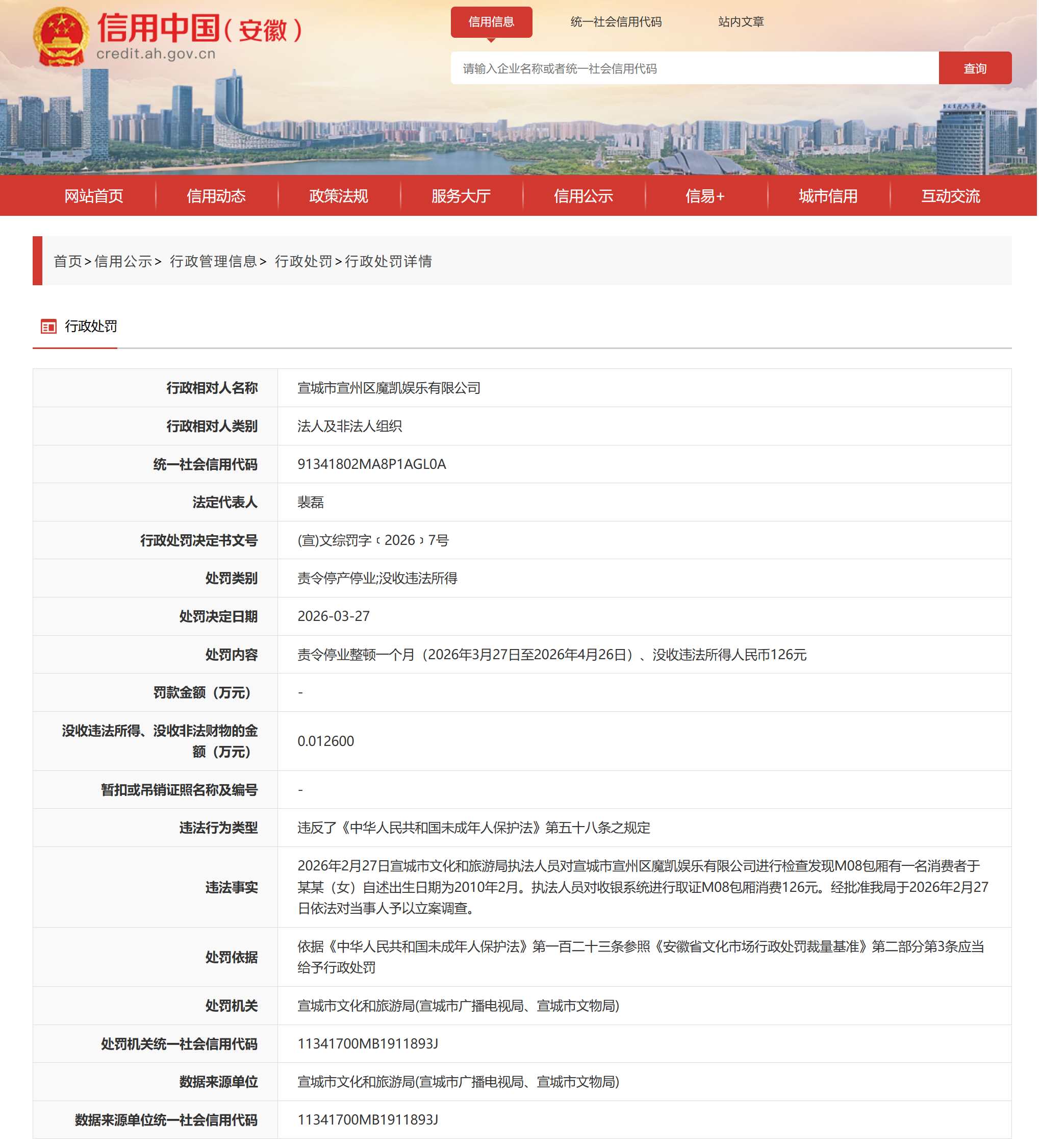 近日,据信用安徽公开披露行政处罚信息,因包厢内有一名消费者系未成年人,宣城市宣州区魔凯娱乐有限公司被责令停业整顿一个月,并被没收违法所得人民币126元。行政处罚决定书文号为(宣)文综罚字﹝2026﹞7号。