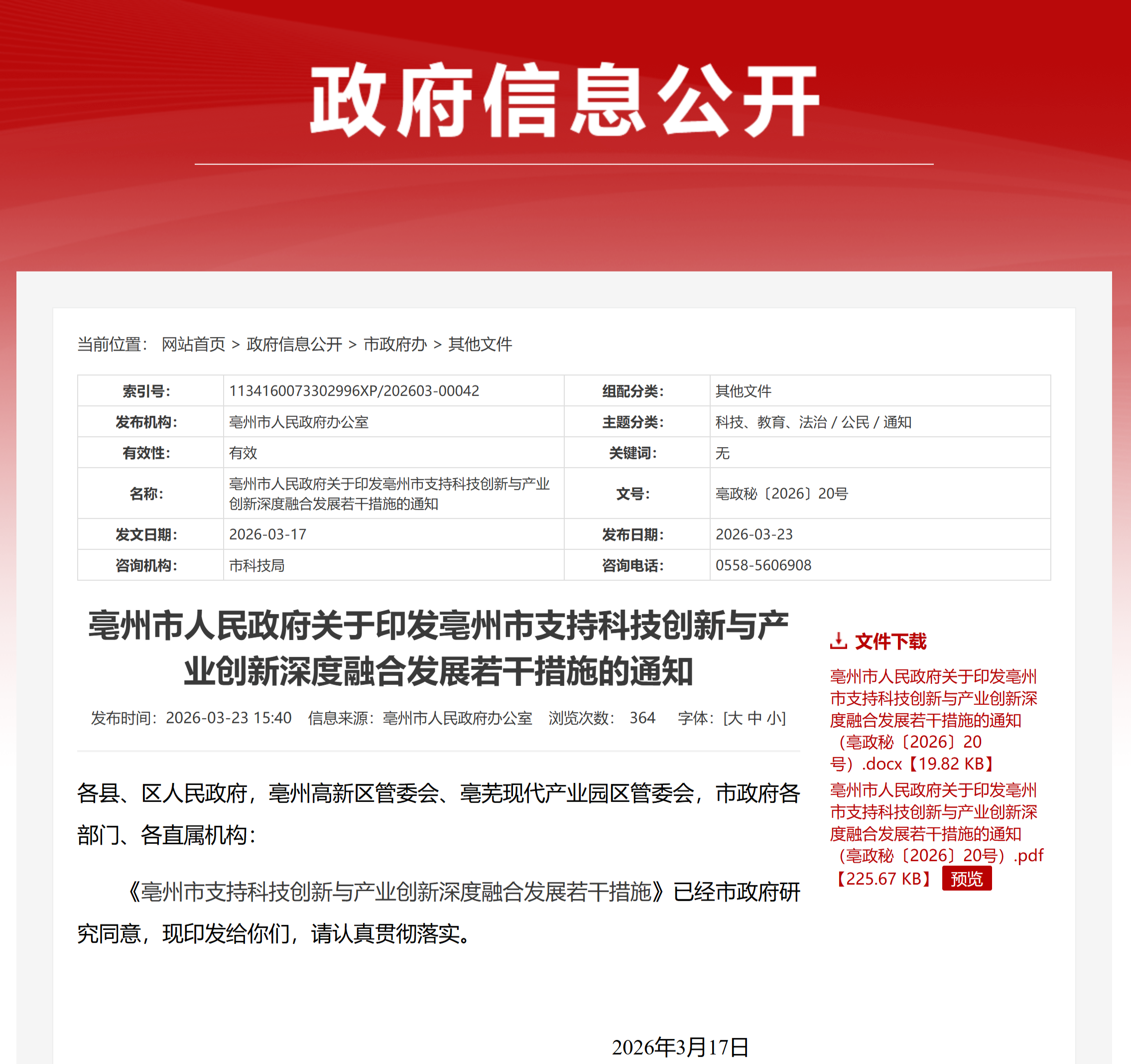 亳州市支持科技创新与产业创新深度融合发展若干措施