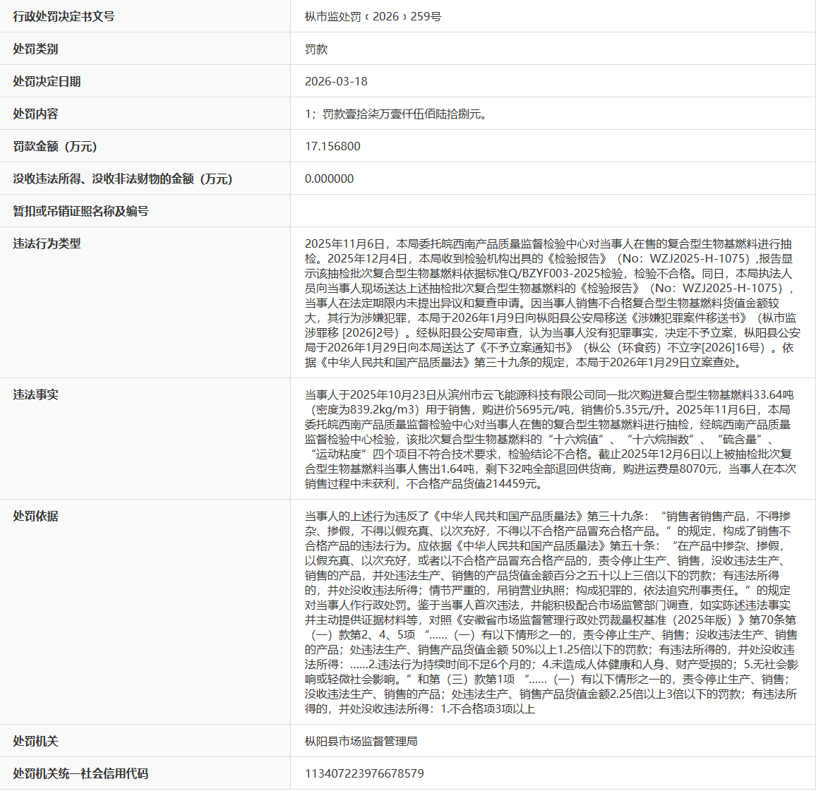 公开处罚信息显示,2025年11月6日,枞阳县市场监督管理局委托皖西南产品质量监督检验中心对当事人在售的复合型生物基燃料进行抽检。2025年12月4日,枞阳县市场监督管理局收到检验机构出具的《检验报告》(No:WZJ2025-H-1075),报告显示该抽检批次复合型生物基燃料依据标准Q/BZYF003-2025检验,检验不合格。同日,枞阳县市场监督管理局执法人员向当事人现场送达上述抽检批次复合型生物基燃料的《检验报告》(No:WZJ2025-H-1075),当事人在法定期限内未提出异议和复查申请。因当事人销售不合格复合型生物基燃料货值金额较大,其行为涉嫌犯罪,枞阳县市场监督管理局于2026年1月9日向枞阳县公安局移送《涉嫌犯罪案件移送书》(枞市监涉罪移 [2026]2号)。经枞阳县公安局审查,认为当事人没有犯罪事实,决定不予立案,枞阳县公安局于2026年1月29日向本局送达了《不予立案通知书》(枞公(环食药)不立字[2026]16号)。依据《中华人民共和国产品质量法》第三十九条的规定,枞阳县市场监督管理局于2026年1月29日立案查处。