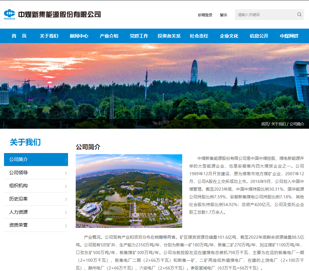 总公司中煤新集能源股份有限公司官网显示,中煤新集能源股份有限公司是中国中煤控股、煤电新能源并举的大型能源企业,也是安徽省内四大煤炭企业之一。公司1989年12月开发建设,原为淮南市地方煤矿企业,2007年12月,公司A股在上交所成功上市。2016年9月,公司划入中国中煤管理。截至2023年底,中国中煤持股比例30.31%,国华能源公司持股比例7.59%,安徽新集煤电公司持股比例7.18%,其他社会股东持股比例54.92%;总资产420亿元,公司及受托企业职工总数1.7万余人。公司现有产业和项目分布在皖赣等两省。矿区煤炭资源总储量101.6亿吨,截至2022年底剩余资源储量88.5亿吨。