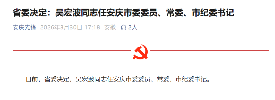 据安庆先锋3月30日消息,日前,省委决定,吴宏波同志任安庆市委委员、常委、市纪委书记。