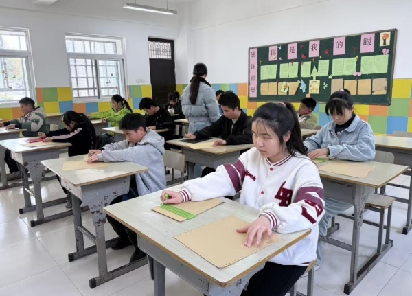 本次比赛分为义教组与中专组,共21名学生参赛。义教组11名选手来自小学部与初中部,中专组10名选手则涵盖中医康复技术、播音与主持两大专业。比赛现场,同学们端坐于课桌前,指尖在盲文板与点位纸上灵活游走,专注而沉稳地敲击出一个个标准点位,将文字化作可触摸的“光明语言”。裁判老师顾庆、吴瑶全程认真监考,细致巡查,确保比赛公平、有序进行。