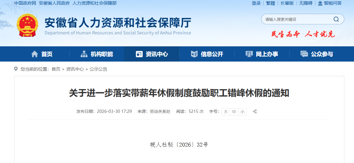 3月30日,安徽省人力资源和社会保障厅发布《关于进一步落实带薪年休假制度鼓励职工错峰休假的通知》,详情如下: