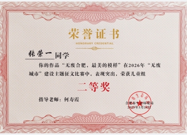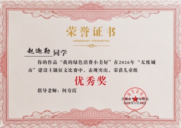 近日,“绿动合肥 无废友约”合肥市 2026 年“无废城市”建设主题征文比赛获奖名单正式公示。合肥市四河小学学子积极参与、用心创作,在全市众多参赛作品中脱颖而出,张荣一、赵迦勒、李婉童、陶阳昊四位同学荣获市级奖项,其中张荣一同学受邀参加现场授奖仪式,为学校增添荣光!