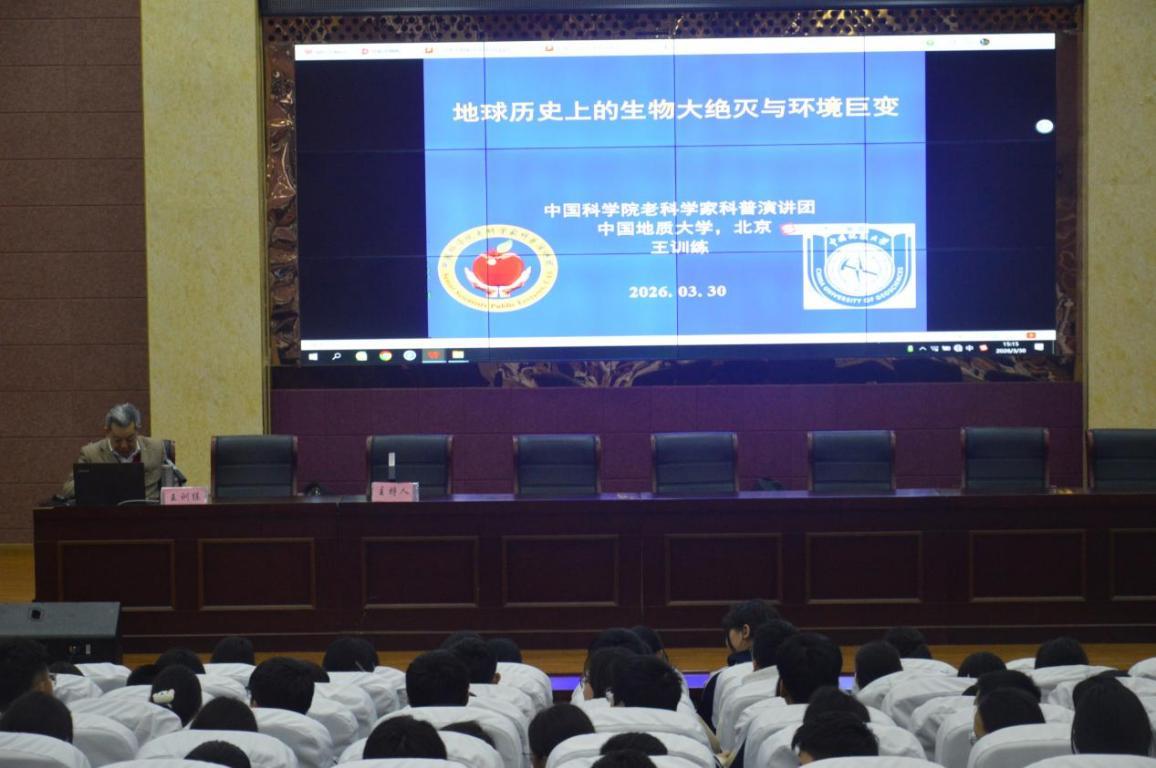 3月30日下午,来安县新安中学报告厅座无虚席,曾是中国地质大学教授、博士生导师,现任中国古生物学会常务理事的王训练同志正应邀给学校部分学生做主题为《地球上的生物大局灭与环境巨变》的科普讲座。这位主要从事古生物地层学、历史、大地构造学研究,享受国务院特殊津贴的老科学家通过浅显易懂的言语,给同学们细致展现了生物大局灭与环境巨变的理念。校领导和同学们一起聆听了讲座。