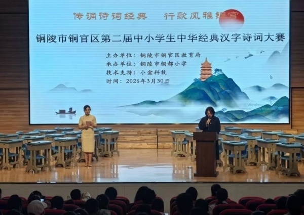 春日书香满校园,经典诗词润童心。3月30日,由铜陵市铜官区教育局主办、铜陵市铜都小学承办、小盒科技提供技术支持的铜官区第二届中小学生中华经典汉字诗词大赛,在铜都小学大礼堂顺利举办。全区39支中小学代表队、222 名参赛选手齐聚赛场,以字为媒、以诗会友,共赴一场中华经典文化的盛宴。