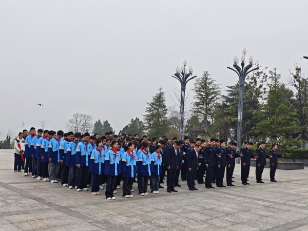活动现场,全体人员神情肃穆、列队整齐,身着制服的干部职工与佩戴红领巾的五中师生共同组成庄重的祭扫方阵,在巍峨的烈士纪念塔前静立。随着雄壮的《义勇军进行曲》奏响,全体人员肃立行注目礼,歌声回荡在陵园上空,传递着对革命先烈的无限敬仰。