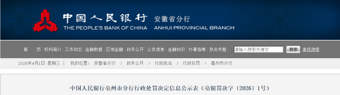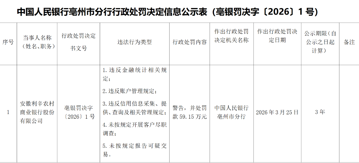 近日,据“中国人民银行安徽省分行”公开披露行政处罚信息,安徽利辛农村商业银行股份有限公司被警告,并处罚款59.15万元。行政处罚决定书文号是亳银罚决字〔2026〕1号。