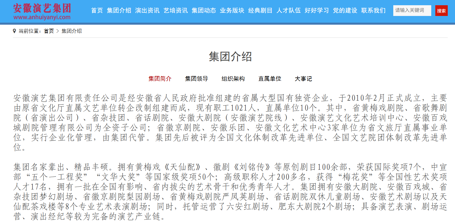 安徽演艺集团官网信息显示,安徽演艺集团有限责任公司是经安徽省人民政府批准组建的省属大型国有独资企业,于2010年2月正式成立,主要由原省文化厅直属文艺单位转企改制组建而成,现有职工1021人,直属单位10个。其中,省黄梅戏剧院、省歌舞剧院(省演出公司)、省杂技团、省话剧院、安徽大剧院(安徽演艺院线)、安徽演艺文化艺术培训中心、安徽百戏城剧院管理有限公司为全资子公司;省徽京剧院、安徽乐团、安徽文化艺术中心3家单位为省文旅厅直属事业单位,实行企业化管理,由集团代管。集团先后被评为全国文化体制改革先进单位、全国文艺院团体制改革先进单位。