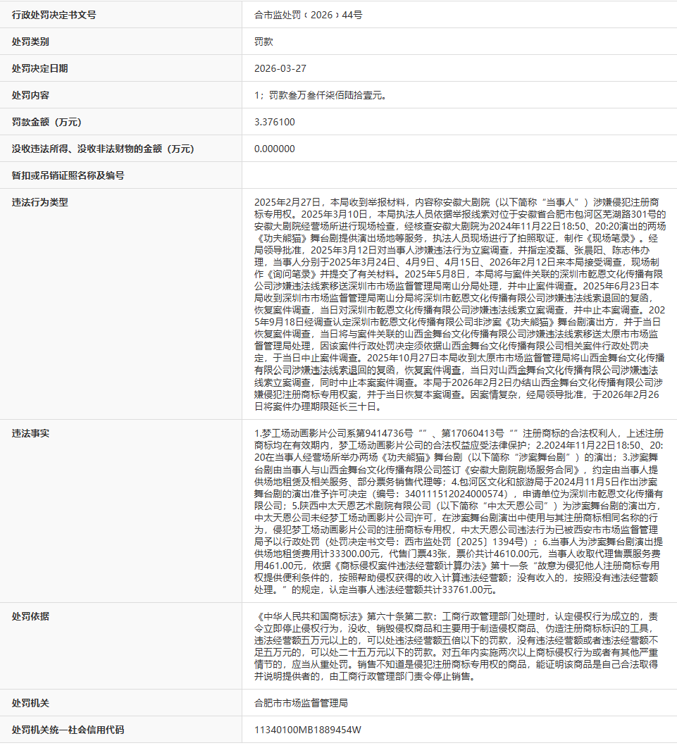 公开处罚信息显示,2025年2月27日,合肥市市场监督管理局收到举报材料,内容称安徽大剧院(以下简称“当事人”)涉嫌侵犯注册商标专用权。2025年3月10日,合肥市市场监督管理局执法人员依据举报线索对位于安徽省合肥市包河区芜湖路301号的安徽大剧院经营场所进行现场检查,经核查安徽大剧院为2024年11月22日18:50、20:20演出的两场《功夫熊猫》舞台剧提供演出场地等服务,执法人员现场进行了拍照取证,制作《现场笔录》。经局领导批准,2025年3月12日对当事人涉嫌违法行为立案调查,并指定凌磊、张晨阳、陈志伟办理,当事人分别于2025年3月24日、4月9日、4月15日、2026年2月12日来合肥市市场监督管理局接受调查,现场制作《询问笔录》并提交了有关材料。2025年5月8日,本局将与案件关联的深圳市乾恩文化传播有限公司涉嫌违法线索移送深圳市市场监督管理局南山分局处理,并中止案件调查。