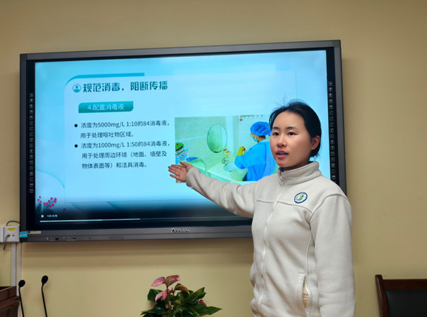 保育培训聚焦春季传染病防控与诺如病毒应急处置。保健老师于露结合春季高发传染病特点,讲解流感、手足口病等预防要点,明确晨午检、通风消毒、缺勤追踪等日常防控要求;重点梳理诺如病毒感染全流程应急处置规范,演示呕吐物处理、环境消杀实操方法,确保保育员熟练掌握应急技能,严防园内传染病传播。