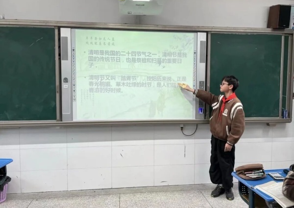 “清明时节,梨花带雨,我们追思那些为民族解放、国家富强抛头颅、洒热血的革命先烈。”三(2)中队的队员费一帆深情讲述董存瑞、刘胡兰、杨靖宇等英雄事迹,字字铿锵、句句动情:“胸前的红领巾是烈士鲜血染就,我们要铭记历史、珍惜当下,以先烈为榜样,勤学善思、崇德向善,让红色基因融入血脉。”这生动的演讲彰显了杏林少年传承红色精神的坚定决心。